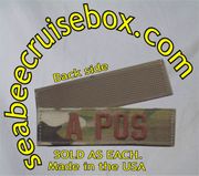 Embroidered MultiCam 4 inch Blood Type tapes with Velcro. The tapes are made from MultiCam fabric and come with hook fastener, Velcro or equivalent. The tapes are 4 inches long so they will fit perfectly on the sleeve Velcro. With the 4 inch size, we are able to offer full sized lettering that is easier to read.